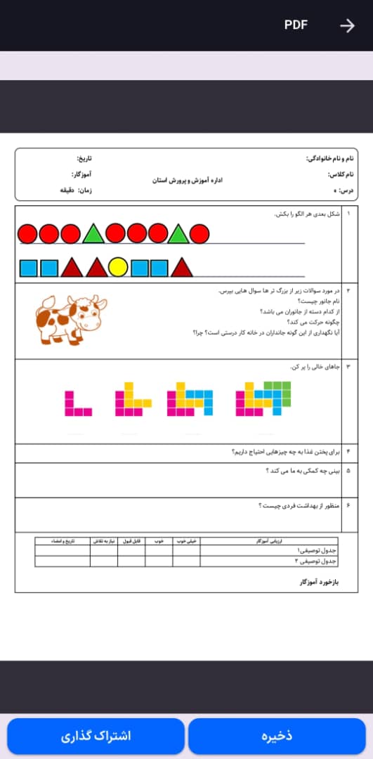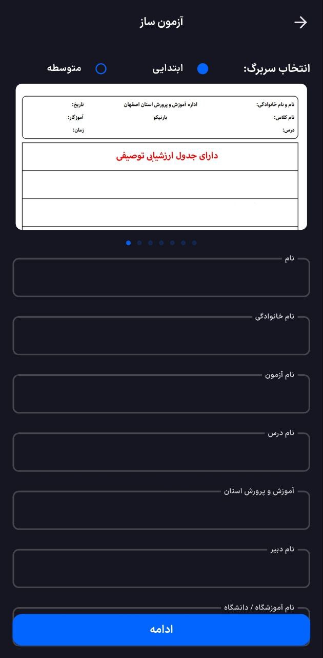 آزمونساز هوشمند: طراحی سریع آزمون با بیش از ۱۰۰هزار سؤال متنوع، جدول ارزشیابی، افزودن تصویر، خروجی PDF و انتخاب خودکار سؤال بر اساس درس و سطح دشواری.